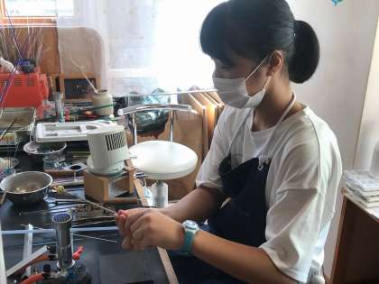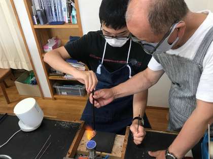 好きな色のガラス棒をえらび、火で溶かしてから丸めています。