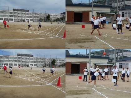 開会式・体操に続いて競技が始まりました。50m走,学級対抗リレー,ハンドボール投げの3つの種目が終了。この後,200m走,400m走,バラエティリレー,全員リレーとまだまだ競技は続きます。クラスの仲間を皆が一生懸命応援しています。