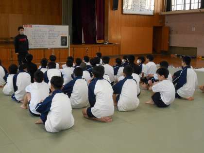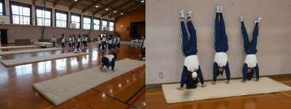 写真は1年生の授業風景です。 男子は柔道,女子はマット運動ですね。