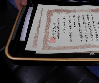 3年生が夏休み課題の一つとして取り組んだ「税についての作文」の中で,3年生I君の「コロナ禍における税金への思い」が京都市左京区租税教育推進協議会長賞,おなじく3年生Sさんの「竹林と府民税」が京都府京都東府税事務所長賞を受賞しました。