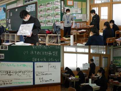 今日は今年度より新規採用となった山中先生の3年生社会科の授業を教育委員会の主事の先生に見ていただきました。3年生にとっては,中学校での授業も数えるほどになりましたが,先生が提示した課題に対して,自分で考え,仲間と意見交換したり考えをまとめたりとしっかりと学んでいました。