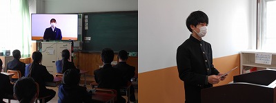 各学級から選出された前期の室長,生活環境委員,文化報道委員,保健衛生委員,体育委員,図書委員への認証式が行われました。認証式の模様は放送室から各教室に配信され,教室では委員の生徒たちへの激励の拍手がおきていました。