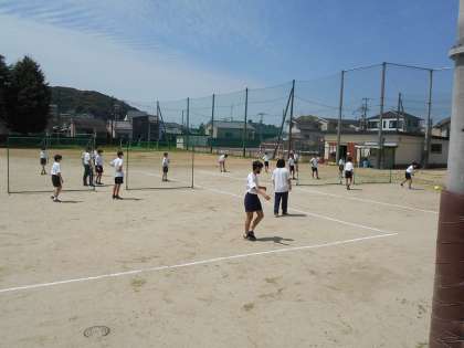 保健体育科では現在,バレーボールの授業が行われています。生徒規模のわりに,本校の体育館は広くて3つのコートをとることができるので男女とも体育館で同時に授業を実施できますが,コロナ禍で密をさけるために今日は男子はグランド,女子は体育館にて授業を行いました。梅雨の中休みで空気も乾燥しており,グランドでの授業もとっても楽しそうでした。