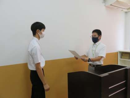 また,このHPでお知らせしていた吹奏楽部の吹奏楽コンクール金賞受賞と男子卓球部の団体戦 京都市・京都府大会の準優勝 近畿大会3位 個人戦での3年生U君 京都府大会優勝を紹介して表彰状の授与を行いました。