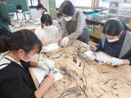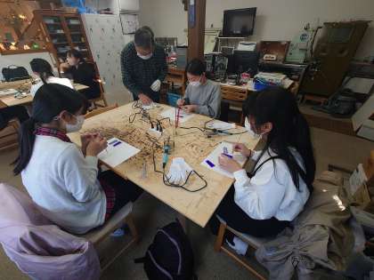 ステンドグラスランプ作りの様子です。