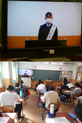 立ち会い演説会は映像配信を利用し、放送室からの中継で行っています。立候補者は「どんな学校にしたいのか」、そのために「具体的に取り組みたいこと」などをみんなに訴え自らへの投票を呼び掛けています。