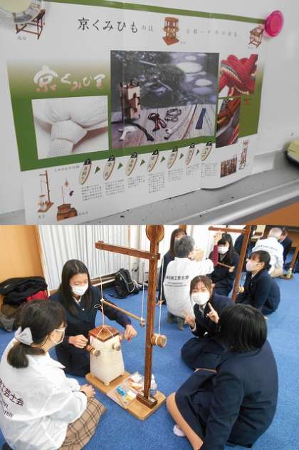 3年生は本日,京くみひも伝統協同組合から講師の先生をお迎えして,「京くみひも」作りを体験しています。この取り組みは,本物の伝統工芸品に触れることを通して,生徒たちが京都の伝統工芸に対する理解を深め,文化・伝統を尊重する態度を育成することを目的に実施されている事業です。