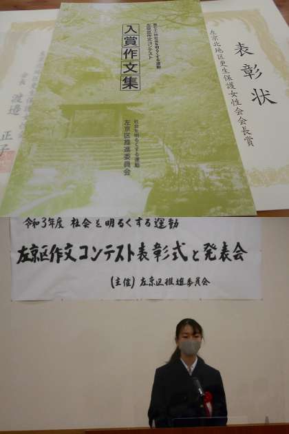 左京区内の小中学校より550を超える作文が応募され,本校の1年生Yさんの「幸せのネットワークを」が左京区保護司会会長賞に,同じく1年生のHさんの「あいさつの力」が左京北地区更生保護女性会会長賞に入賞しました。