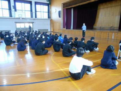 今日の集会では,進路指導の山岡先生から,受験は孤独な闘いに感じるが,学級や学年といった「集団のみんなで頑張ろう」という雰囲気で臨むことが大切 と話をされました。 3年生,頑張れ!!