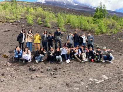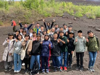 山道の途中でクラス写真を撮りました!足下にたくさんの溶岩の塊が見られます!