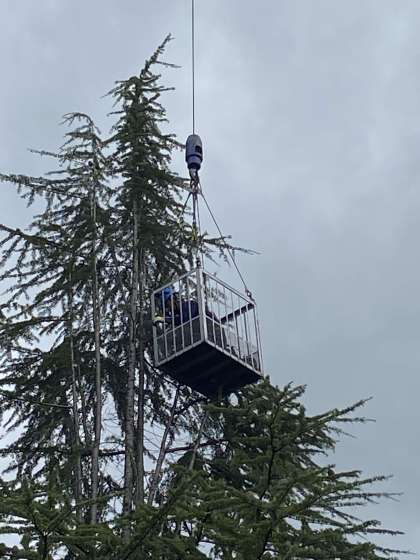 大型クレーン車を駆使してすっきり剪定していただいています!