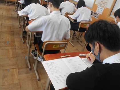 本日の授業風景は2年4組です。定期テストに必死に向き合っている生徒の真剣な姿が写真からも伝わってきます。