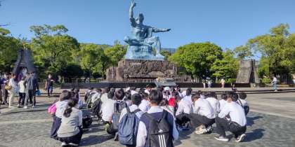 今回の修学旅行での目的の一つである長崎原爆資料館での平和学習、平和祈念像前でのセレモニーを行いました。