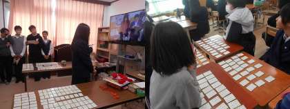 1年生が、放送室と各教室をオンラインでつないで国語科の学習として取り組んだ古典の内容を踏まえた「百人一首大会」に取り組んでいるのです。