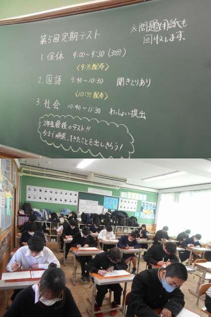 今日は春の訪れを感じさせる気候となりました。1・2年生は本日より3日間、今年度最後の定期テスト(第5回定期テスト)に取り組んでいます。1年間の学習の総まとめとして各自がしっかりと力を発揮してくれることを期待しています!