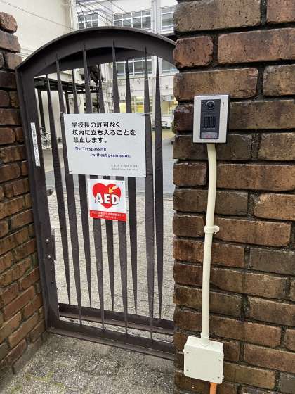 お子たちの遅刻・早退時や保護者のみなさまが上記時間帯に来校される際は,通用門横の「インターホン」を鳴らしていただき,職員室モニターで確認後,ロック解除され入校していただくこととなります。また,お帰りの際もインターホンを鳴らしていただければ,ロックが解除されるようになっております