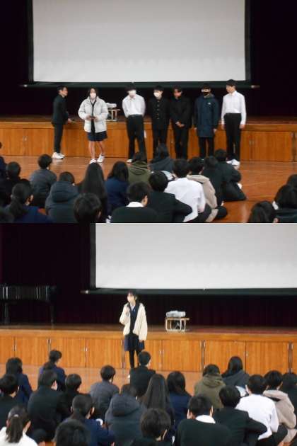 続いて行われた生徒集会では、生徒会中央委員の一人一人から、活動の振り返りと進級してからの意欲が発表されました。