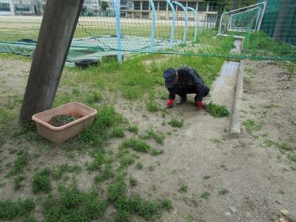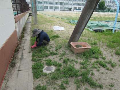 今月末の定期テスト後から、プールの授業が始まります。それに向け、またこれからのグランド使用に向け、用務員の若井さんと校務支援員の道上先生が草抜きを日々行ってくれています。先日は西門付近の側溝のふたを取り、中の掃除をしてくださいました。