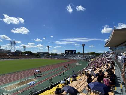 夏季大会以降、初めての公式大会となった今回は、各校1・2年生のみの参加となりました。当日は,晴天に恵まれスタジアムの気温も上昇しましたが,レールの合間に時折吹く風が心地よく、スタンドで観戦していると秋の気配を感じることもありました。