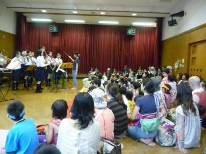 7月14日、錦林保育園でのお祭りで吹奏楽部が子供たちに楽しい演奏を披露しました。目前での生演奏とたのしい曲目当てクイズに保育園児も大喜びでした。