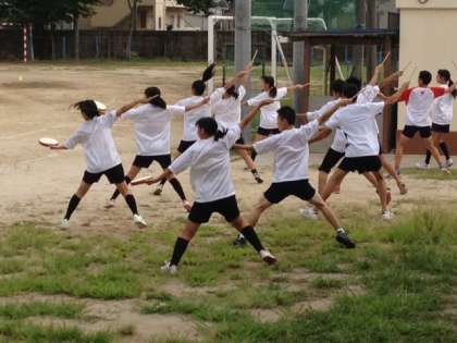 岡崎レッドカーペットで披露する「エイサー」をグラウンドで練習しました。本番を想定して屋外での響きを確かめ、感覚をつける練習で、さらに見ごたえ、聞きごたえもでてきました。