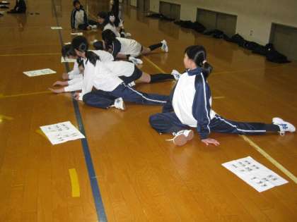 講師として地域の整形外科病院の理学療法士の先生を2名お招きして「スポーツによるけがの予防」をテーマに,理論と実習をしていただきました。