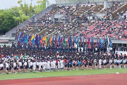そこでは毎年,各中学校の選手団が入場行進を行いますが,今年は岡崎中学校がすべての学校の先頭で入場しました。