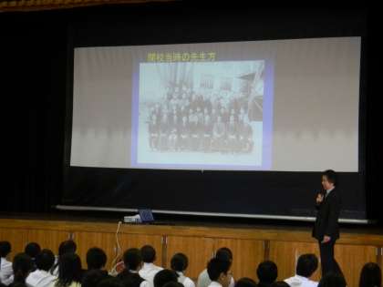 当時の写真などを交えながら学校長より岡崎中学校の歴史について話しました。