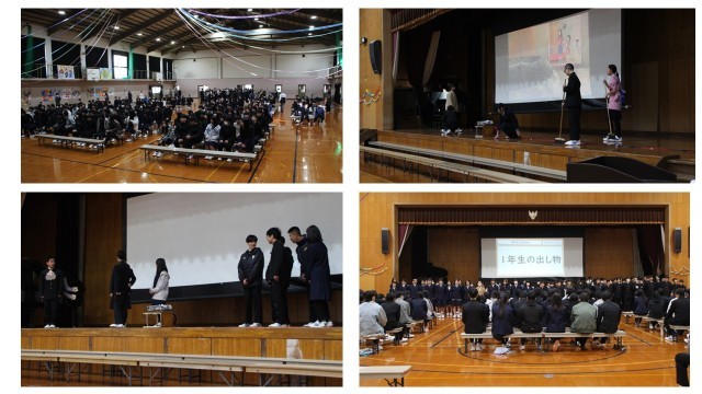 生徒会本部のオープニングで始まり、1年生の感謝のメッセージが文字に変わる動画・合唱の発表、2年生の各クラス3色の色軍手を使ったハンドダンスと歌の発表、そして3年生の群読と「3月9日」の合唱がありました。
