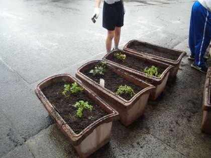 環境委員会では,緑のカーテンづくりをしました。まず,土を混ぜ,プランターに苗を植えていきました。雨が降っているたで渡り廊下での作業でした。12コのプランターが完成しています。