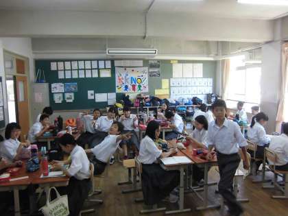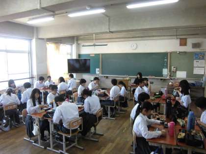 1年生は,中学校の昼食が始まって約2か月がたちました。班で机を合わせ,全員がそろってから食べ始めています。昼食時間は,12:35からの15分間ですが,もちろん,昼食時間が終了してから食べていてもだいじょうぶです。写真は,各クラスの昼食開始直後の様子です。