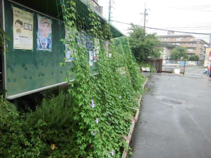 学校の南校舎の北側に設置された緑のカーテンは,6月に環境委員会の生徒が設置してくれたものです。まさに環境教育の「生きた教材」で,毎日ぐんぐん屋上を目指して伸びています。