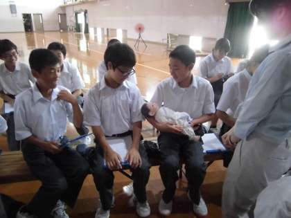 1年生は5時間目に体育館で,左京保健センターから講師をお招きし,生命の誕生について学びました。今回の学習の目的は,心身の発達を科学的に理解し,性に対する適切な判断力と豊かな心情を養うとともに,男性と女性が互いに尊重し,協力し合い民主的で健全な社会を営むことのできる能力や態度を育成することです。途中,「赤ちゃん抱っこ体験」をしました。抱き方の説明の後,実際に赤ちゃんにみたてた人形を名前を呼びかけながら抱っこしました。本日お越しいただいた講師の先生に感謝します。