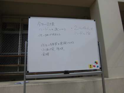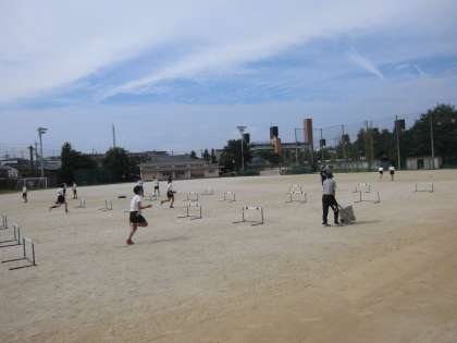 2年生の保健体躯の授業では,ハードル走が行われています。今日の授業は,教育実習生が担当し,2名の保健体育科教員が指導に入っています。本時の目標は,「ハードルを遠くから低く飛び越えることができる」です。生徒たちは,どのように足を振り上げ,どんなふうに足を抜くと早く走り抜けることができるのか,踏み切りの位置をどこにすると同じ歩幅で駆け抜けることができるのかということについて練習を行いました。まずはじめは,4人程度のグループで1台のハードルを使っての練習です。次に,4〜5台のハードルを使い練習です。時間の経過とともに,少しずつ上達しています。