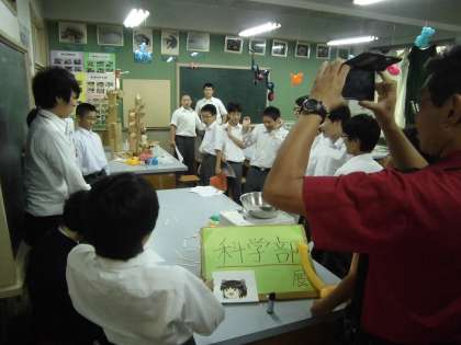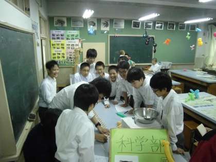 展示鑑賞の様子を紹介します。まず,科学部です。実験がうまくいくか生徒が覗き込んでいます。成功したようです。