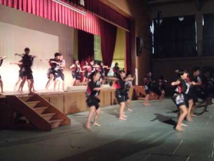 お待たせしました。3年「京炎そでふれ」です。京都学生祭典の踊り普及部の大学生の皆さんのご指導のおかげで,だんだん上手に演じることができるようになりました。