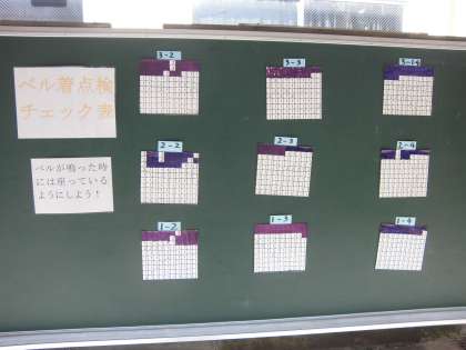 昨日から生活委員会主催のベル着点検週間が始まりました。各学年・学級の委員の声掛けのもと,チャイムより前に座席に座って次の授業の準備をしています。意識することです。意識すればそれは習慣になります。写真はベル着結果の報告用紙です。今回は塗りつぶしていくとどんな絵(模様)になるのでしょうか。