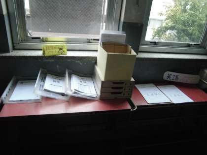 1年生の校舎の階段にある学習教材です。英語と数学が置いてあります。やってみよう思った時に自宅に持って帰り学習を進めることができます。