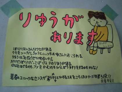 1年生校舎の階段にある図書委員会の掲示物です。図書委員会では,少しでも本を読んでもらえるよう,このようなポスターを,各学年の校舎の廊下や階段に掲示しています。図書委員さんの手書きの文字と挿絵はとても味があり,「どんな理由があるのだろう」と興味がわいてきます。
