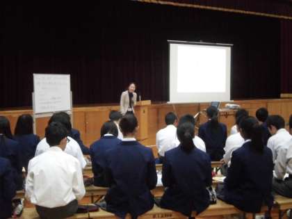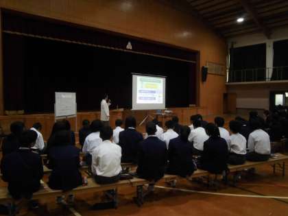 5時間目に1年生は体育館に集まり,「生命のがん教育」の授業を受けました。2名の講師の方にお越しいただきました。前半には,京都大学医学部付属病院のお医者様から,健康的な生活習慣を身につけるとはどういうことかというお話を聞き,後半は,京都府がん教育推進メッセンジャーの講師の方からお話,生命の大切さや生きることの素晴らしさに気づかされました。この授業を通して,生徒たちは,生命の大切さや家族のつながりを学んでくれたことと思います。本日お越しいただいた2名の講師の方をはじめ,京都府健康福祉部健康対策課の皆さんに感謝申し上げます。