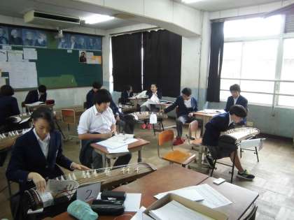 中学校学習指導要領・音楽では,「和楽器については,3学年間を通じて1種類以上の楽器を用いること」を踏襲しつつ,伝統や文化の教育を充実する観点から,「表現活動を通して,生徒が我が国や郷土の伝統音楽のよさを味わうことができるよう工夫すること」ということが示され,器楽の指導において和楽器を用いる趣旨が明らかにされています。高野中学校では,この時期,1,2年生で琴の学習(3年生は1年生で学習)が行われています。写真は「さくらさくら・・・」と練習をしているところです。「さくら」は、日本古来から伝わる音楽で、小学校の歌唱や器楽演奏などでも学習したことがある曲です。生徒たちは,箏曲のよさを味わいながら鑑賞や演奏をしているのです。