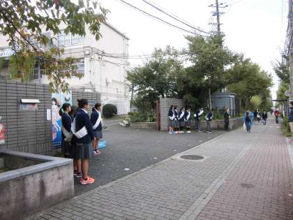 今朝の登校風景です。本日午後,生徒会本部役員選出のための立合い演説会と投開票が行われます。したがって,今日が朝の選挙活動の最終日となります。候補者のみなさんは,早朝から,お昼の時間,放課後も良く頑張りました。