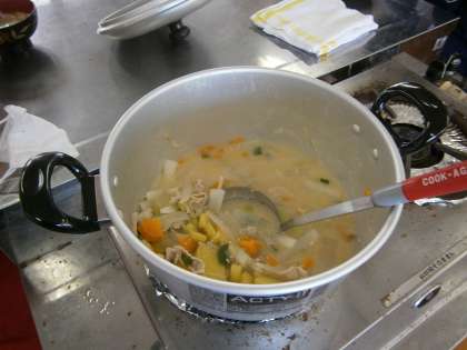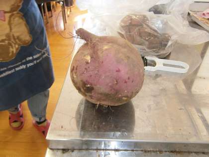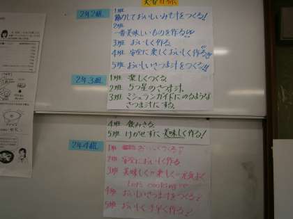2年生の家庭科では,技術科の授業で自分たちが育てた「サツマイモ」を使い,「薩摩汁」をつくりました。各班が調理前に目標を決め,調理開始です。調理室を訪れたときは,ちょうど試食が始まったところで,たくさんの生徒が,お代わりをしていました。写真は,左から各班の目標,育ったサツマイモ,完成した薩摩汁です。
