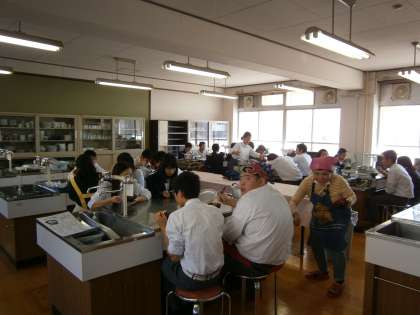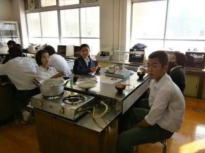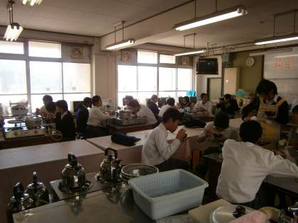 試食時間の様子です。食べているときは静かです。アツアツの薩摩汁を味わっています。さすが,現代っ子は,「冷たい麦茶が欲しい!」と言っていました。