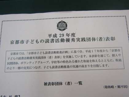 高野中学校では,図書室を「学習・情報センター」,「読書センター」として利活用をしています。このことにかかわり,この度,「平成29年度 京都市子どもの読書活動優秀実践団体(者)表彰」を受賞しました。この賞は,「京都市子ども読書活動推進計画」に基づき,平成17年度から実施されているものです。高野中では,今後も,一層の取り組みの充実と,子ども読書活動推進の気運の高まりを目指します。ありがとうございました。