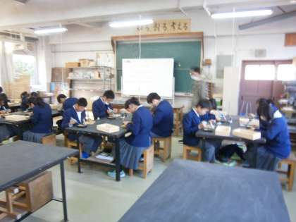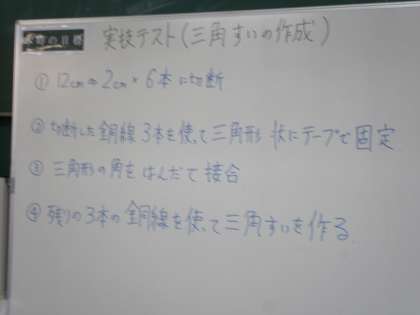2年生の技術・家庭科の技術分野では,「ハンダごてを使った三角すいの作成」という実技テストが行われました。説明の後,いよいよ開始です。生徒たちは,黙々と時間内の完成を目指してで頑張っていました。