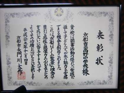 先日もお知らせしましたが,この度,「平成29年度 京都市子どもの読書活動優秀実践団体(者)表彰」を受賞しました。この賞は,「京都市子ども読書活動推進計画」に基づき,平成17年度から実施されているものです。高野中では,今後も,一層の取り組みの充実と,子ども読書活動推進の気運の高まりを目指します。表彰状が届きましたので,ご覧ください。