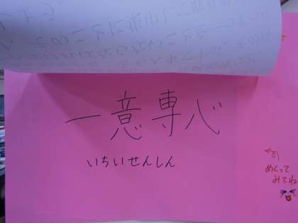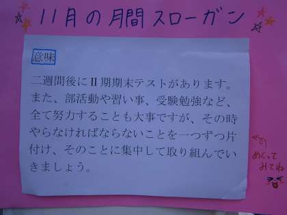 「11月のことば」を紹介します。今回は,生徒会本部役員が担当してくれました。「二週間後に二期中間テストがあります。また,部活動や習い事,受験勉強など,すべて努力することも大事ですが,その時にやらなければならないことを一つずつ片づけ,そのことに集中して取り組んでいきましょう。」とあります。いつも,我々教職員も意識しなければならないようないいことが書いてあります。この画用紙は,今まで廊下や階段で見かけることが多かったのですが,学年によっては,トイレの手洗いに貼ってあります。実は,職員室の入り口を入ったところの柱にも貼ってあります。白い紙をめくると,四字熟語が書いてある(写真右)ところに新生徒会本部の工夫を感じます。