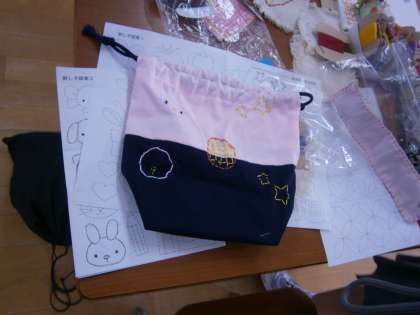 5時間目,1組では,家庭科の授業が行われています。自分がデザインしたものに,選んだ糸で刺繍をしています。完成した作品は,冬の「小さな巨匠展」に出展します。真ん中の写真は,最近完成したお弁当を入れるための袋です。家庭科室のミシンを使って完成しました。温かいものを感じます。