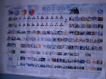 2年生の校舎の階段を3階まで上がると,テーブルと4人から5人が座ることのできるベンチがあります。そして,そのすぐ左の壁には,元素の周期表(元素記号 元素名, 番号 元素を記号で表したもの)が貼ってあります。2年生から元素記号を使って化学反応式を学んでいます。高野中では,生徒たちの目に触れる場所に,学習に関わることが貼ってあります。